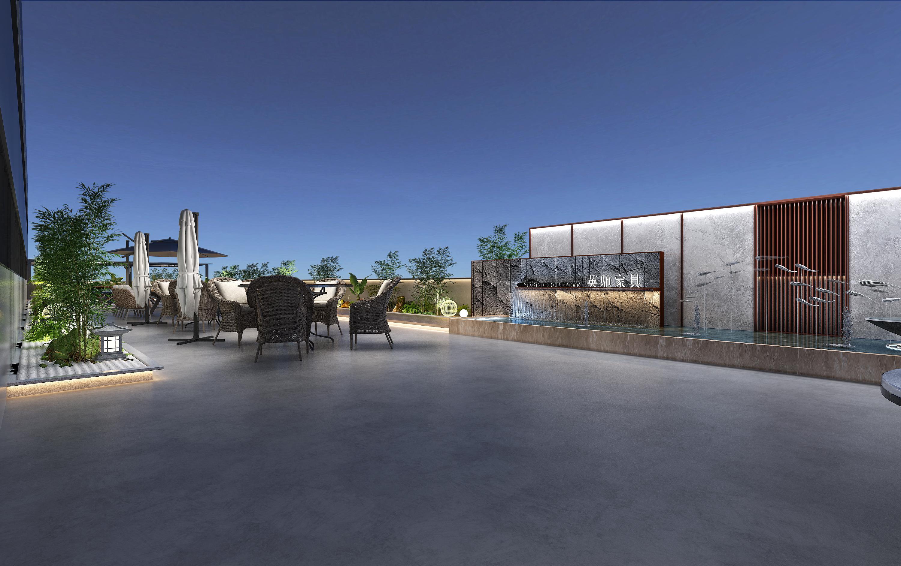 簡單的線條和塊面,打造出簡約而大氣的形象。采用石材與流水相結(jié)合,達(dá)到依山傍水意境. 燈光營造的C字與logo對應(yīng)前行,意蘊(yùn)國內(nèi)、國外兩條線“雙馳前行”。