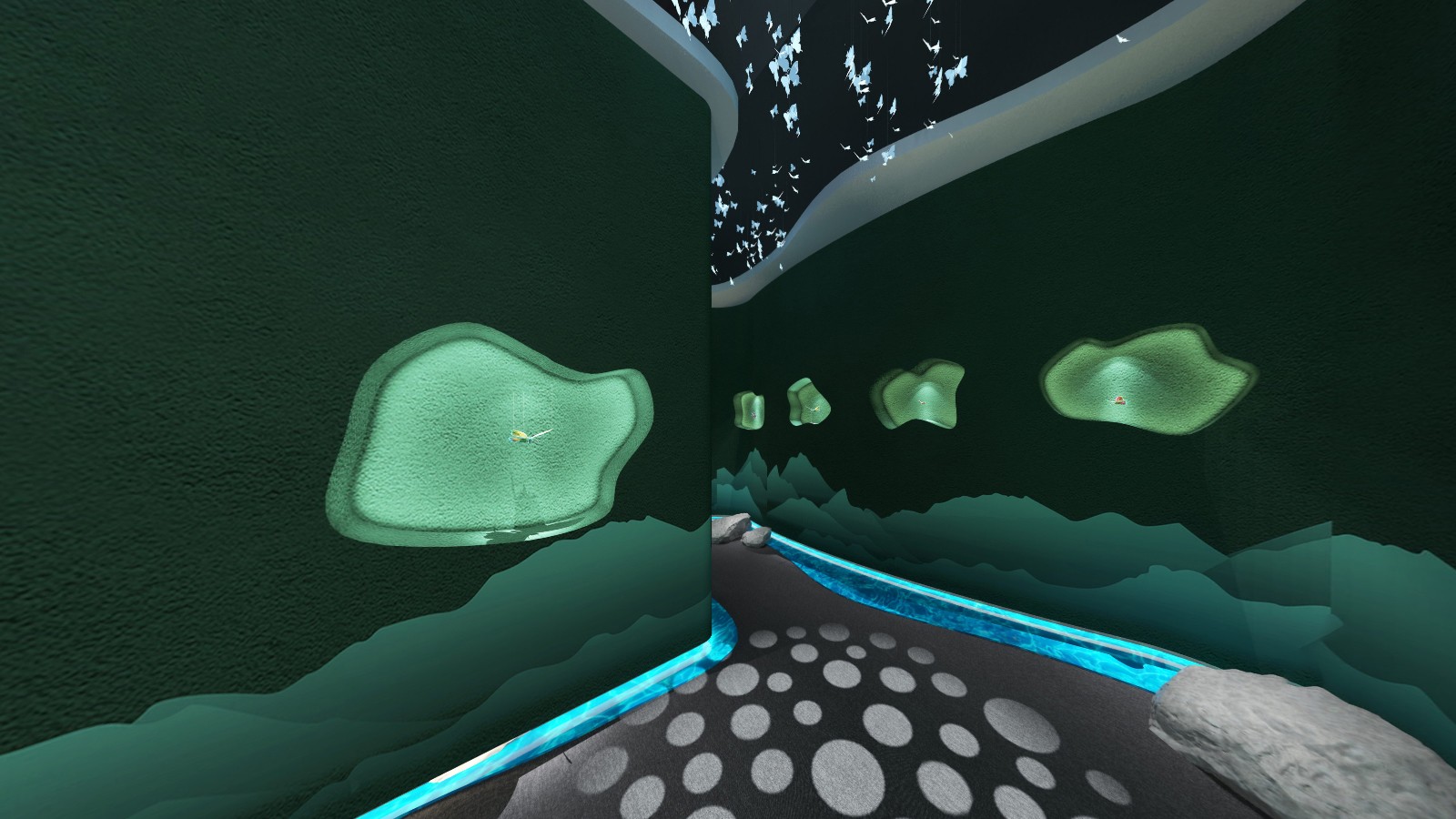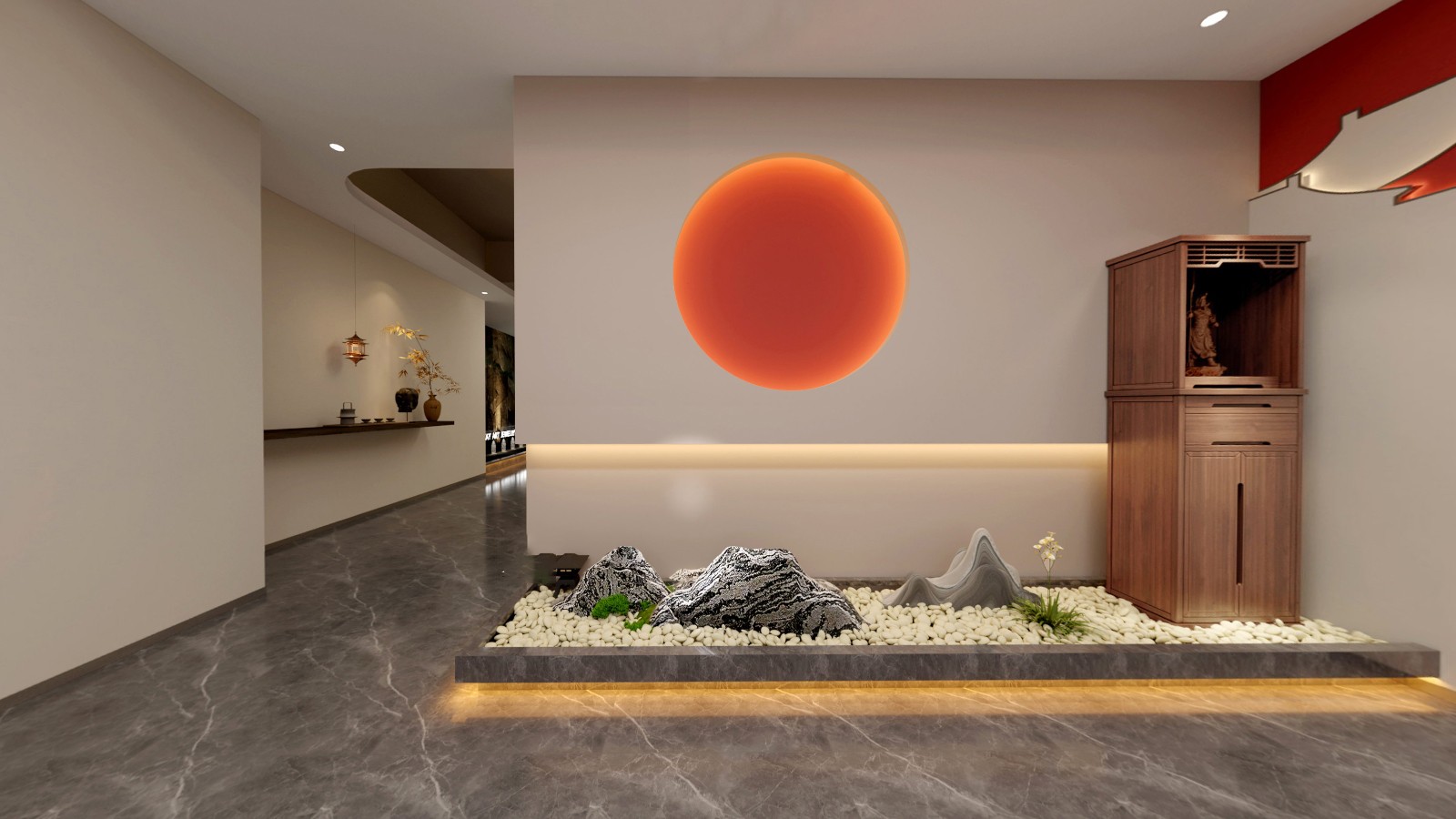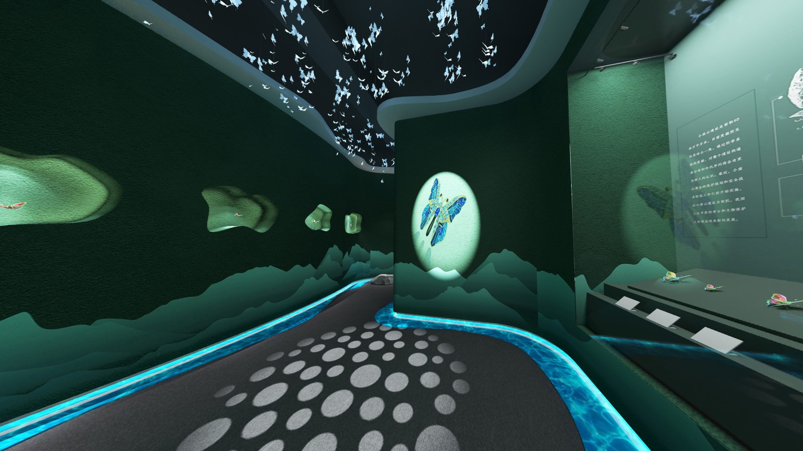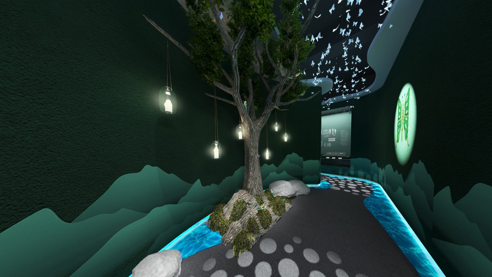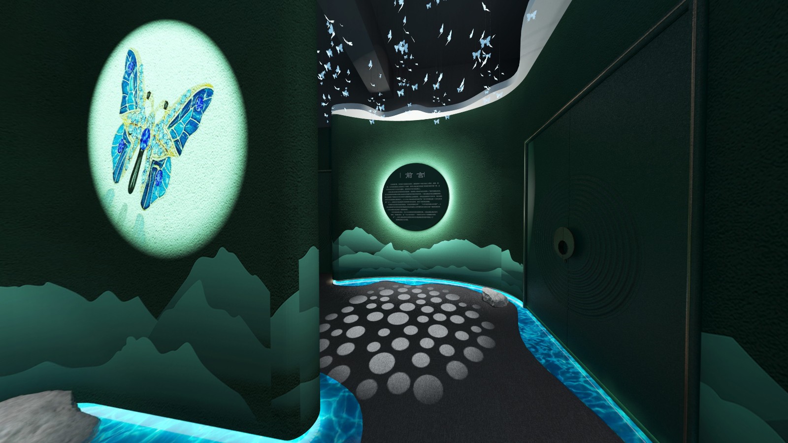 公共區(qū)域借鑒中國山水畫的意境,采用了假山、古樹、原石等造物裝飾,將山水美景移進室內,營造出與自然和諧共生的氛圍.為進入展廳做出了鋪墊。