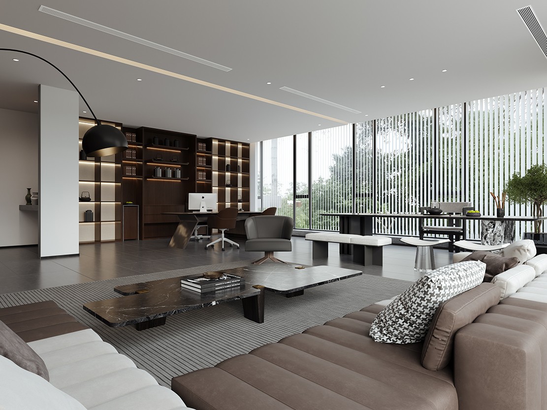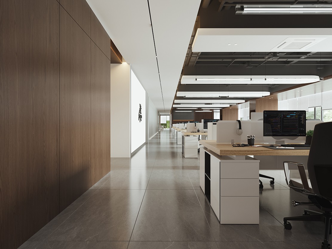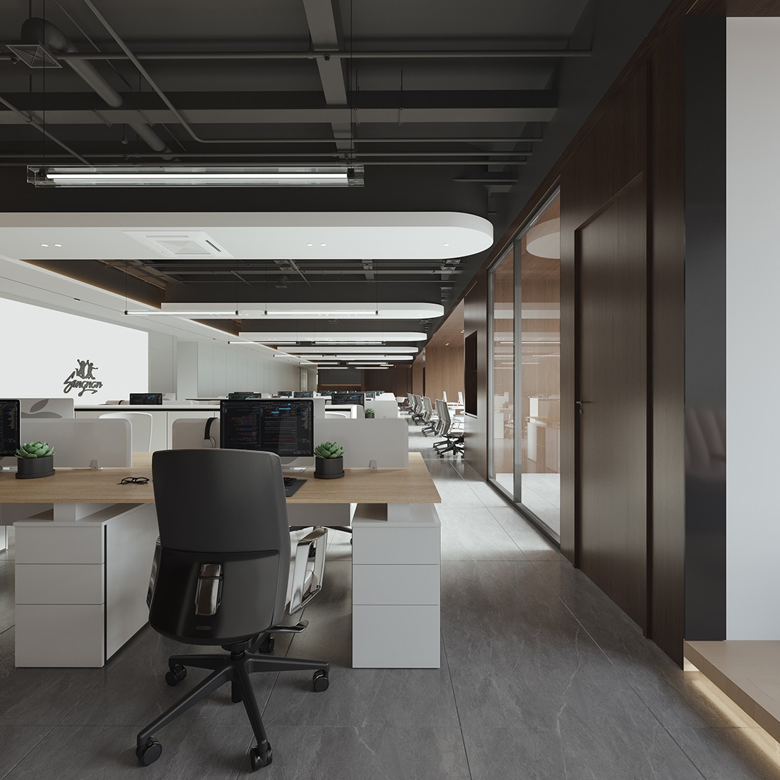 設(shè)計(jì)理念:整體空間以白色和灰色為主色調(diào),采用開(kāi)放式的辦公布局,搭配金屬質(zhì)感的辦公家具和玻璃隔斷,營(yíng)造出簡(jiǎn)潔、現(xiàn)代的科技氛圍。在休息區(qū),設(shè)置了舒適的皮質(zhì)沙發(fā)和精致的茶幾,搭配暖黃色的燈光,為員工提供了一個(gè)放松身心的場(chǎng)所。同時(shí),在辦公室的各個(gè)角落擺放了一些藝術(shù)雕塑和綠植,提升了空間的文化品質(zhì)和自然氣息。