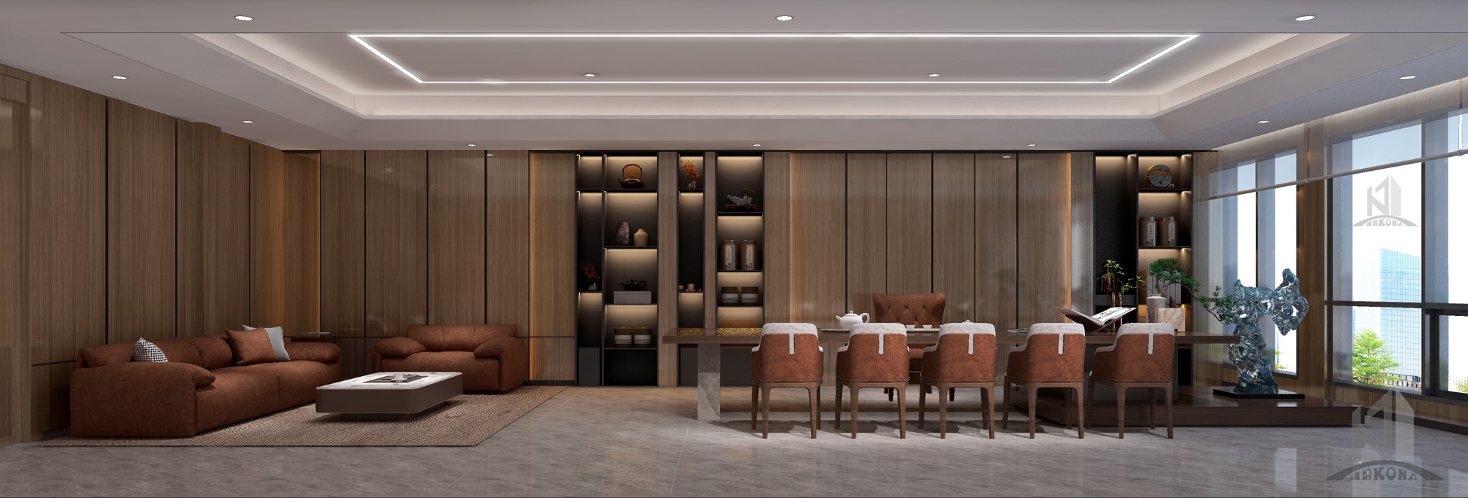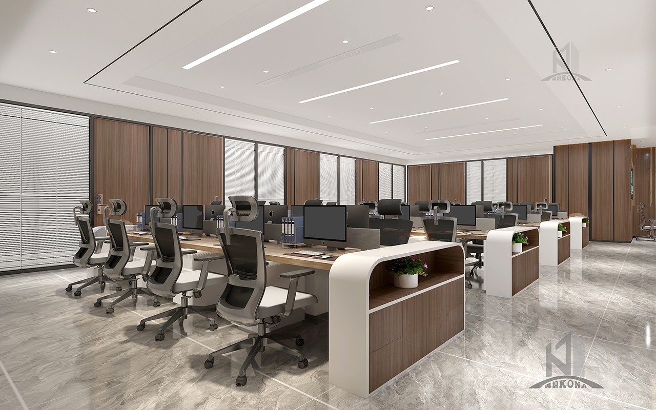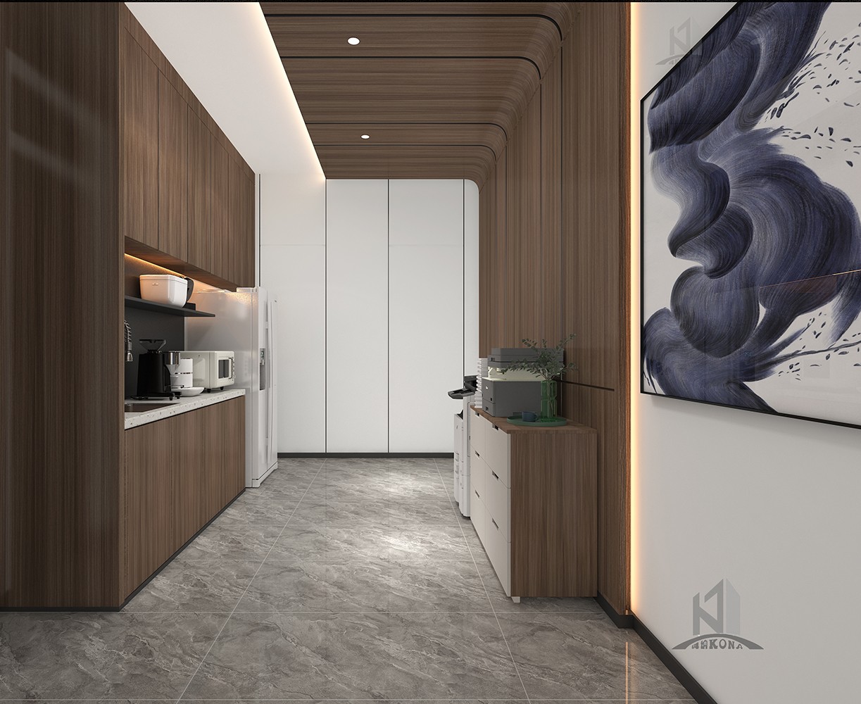 設計理念:傳統(tǒng)企業(yè)融合時代新審美辦公室設計,大塊面的灰色系大理石穿插現(xiàn)代感的線條構建了大家對于公司的初見印象,然而這種高級的現(xiàn)代感或許會顯得冰冷。但加上了深棕色的實木就又為公司的前臺注入了儒雅、沉淀與質樸的大氣,無論時空如何轉換,刻在中國人骨子里的中式風骨,千百年后依然在我們的設計語言中,獵獵作響。辦公室頂面用線條強調虛實及縱深,以實木構件表達建筑語言,干凈簡潔的辦公區(qū)域加上了更加濃墨重彩的傳統(tǒng)中式風格細節(jié),于寂靜無聲中展露中國歷史人文的厚重,還有更多現(xiàn)代與傳統(tǒng)融合的可能性。會議室呈簡潔大氣,端莊肅穆的風格,彌漫著一點莊重的儀式感,深棕色、灰色、白色互相融合搭配,這個色系顯得純粹而有力量,在純凈的空間里,人們更容易獲得精神的沉淀,也更容易探尋到真誠的本質。除此之外,利用巨大的落地窗,可以減輕空間的沉悶,中和會議室的氛圍。