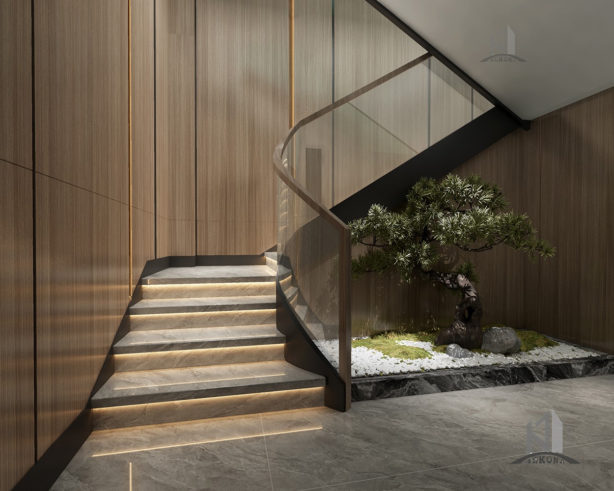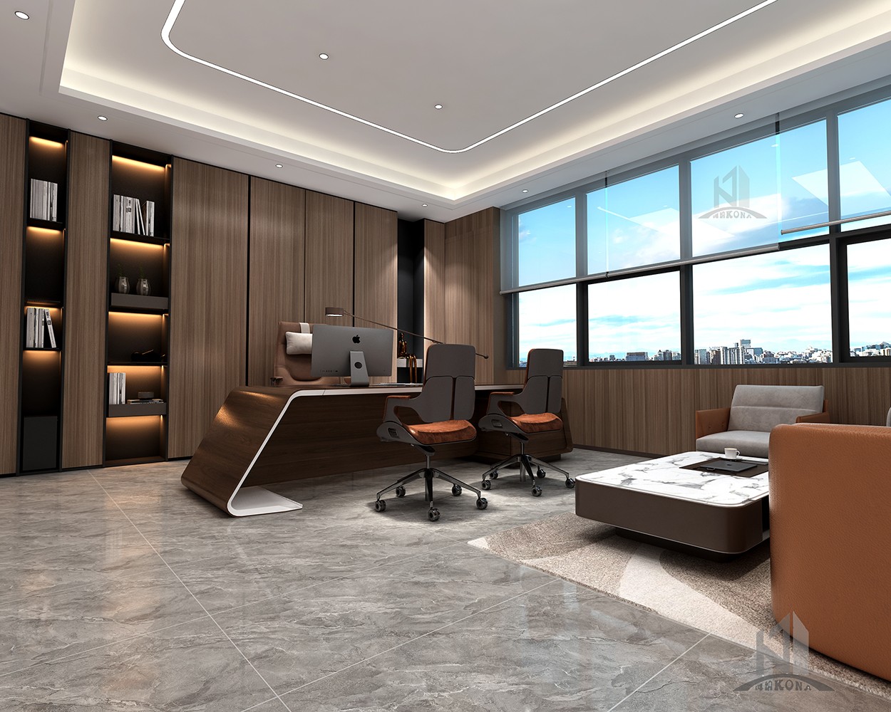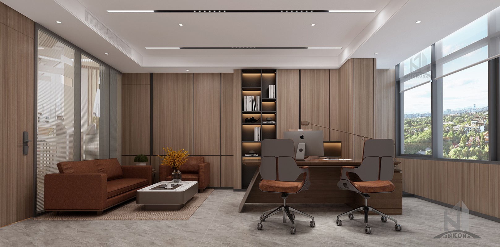 設計理念:傳統(tǒng)企業(yè)融合時代新審美辦公室設計,大塊面的灰色系大理石穿插現(xiàn)代感的線條構建了大家對于公司的初見印象,然而這種高級的現(xiàn)代感或許會顯得冰冷。但加上了深棕色的實木就又為公司的前臺注入了儒雅、沉淀與質樸的大氣,無論時空如何轉換,刻在中國人骨子里的中式風骨,千百年后依然在我們的設計語言中,獵獵作響。辦公室頂面用線條強調虛實及縱深,以實木構件表達建筑語言,干凈簡潔的辦公區(qū)域加上了更加濃墨重彩的傳統(tǒng)中式風格細節(jié),于寂靜無聲中展露中國歷史人文的厚重,還有更多現(xiàn)代與傳統(tǒng)融合的可能性。會議室呈簡潔大氣,端莊肅穆的風格,彌漫著一點莊重的儀式感,深棕色、灰色、白色互相融合搭配,這個色系顯得純粹而有力量,在純凈的空間里,人們更容易獲得精神的沉淀,也更容易探尋到真誠的本質。除此之外,利用巨大的落地窗,可以減輕空間的沉悶,中和會議室的氛圍。