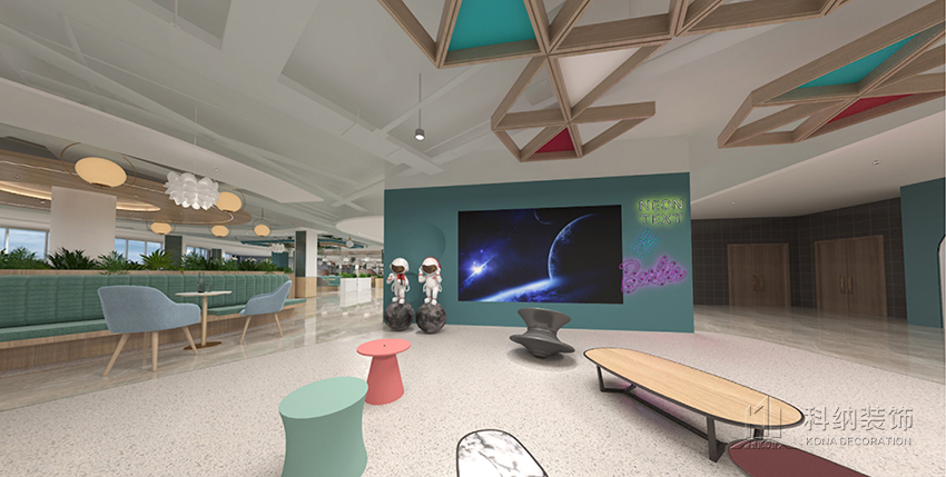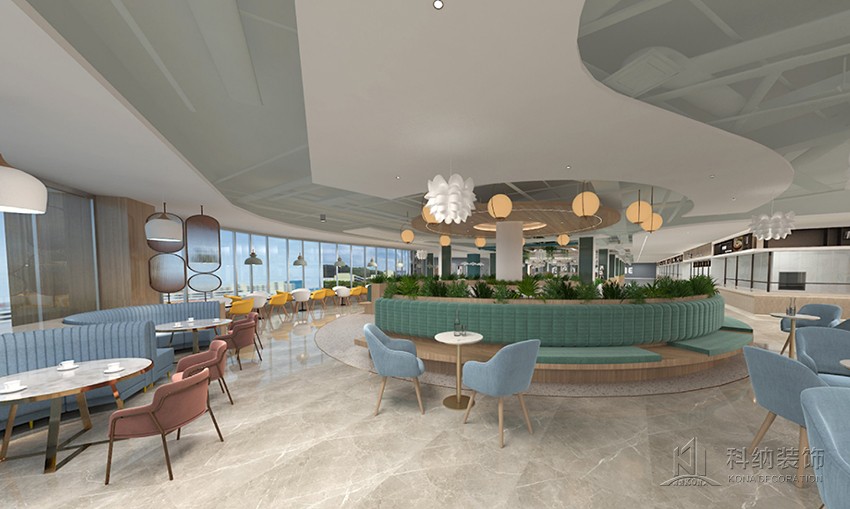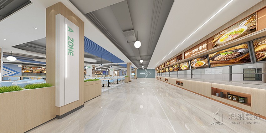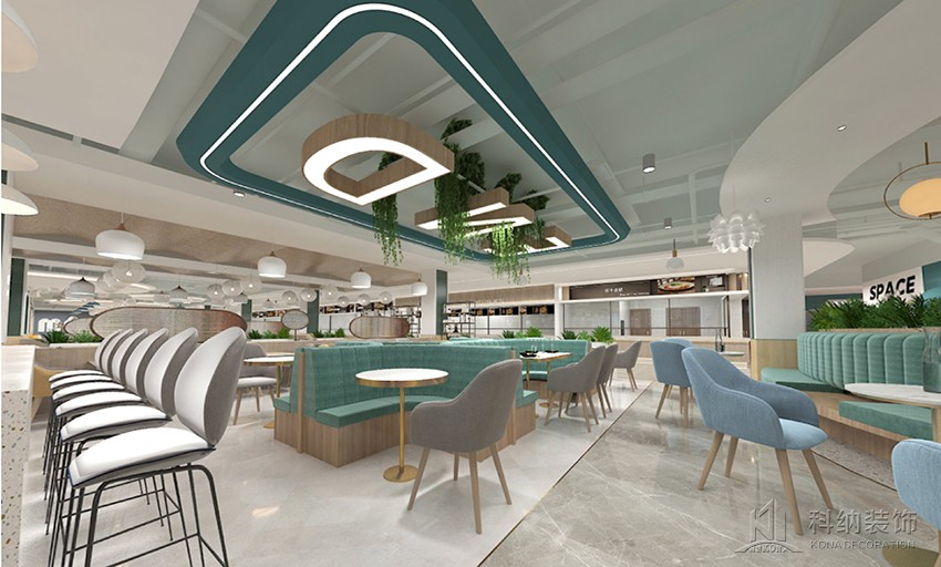 設(shè)計理念:空間設(shè)計力在突破傳統(tǒng)食堂形式,表達校園食堂快樂食間品牌意識,傳遞快樂食間價值觀。為學(xué)生和老師提供有品位的就餐環(huán)境,享受美食之外還具有學(xué)習(xí)、聚會、獨處的空間功能。整體空間在以白色為主基調(diào)的設(shè)計中,將天花裝飾藍色,柱子選用了一點墨綠色進行點綴,以注入環(huán)保、科技、自然等元素,呈現(xiàn)出美感與實用兼?zhèn)涞膭?chuàng)新設(shè)計。木質(zhì)桌椅溫潤自然,大盆綠植規(guī)律擺放,搭配錯落有致,整個空間自然開闊。