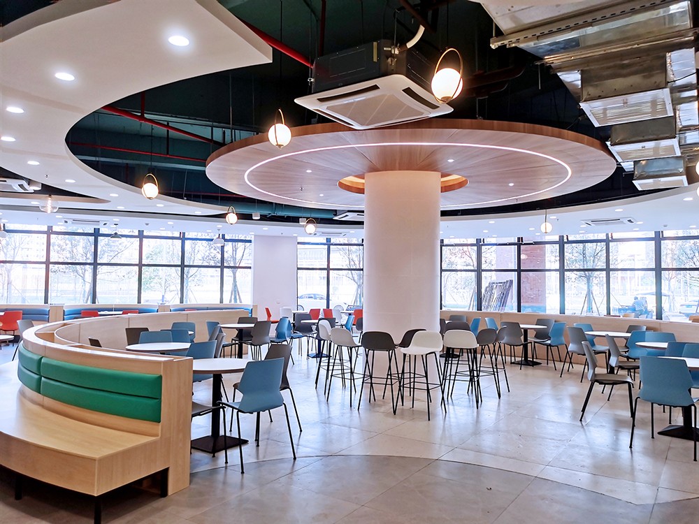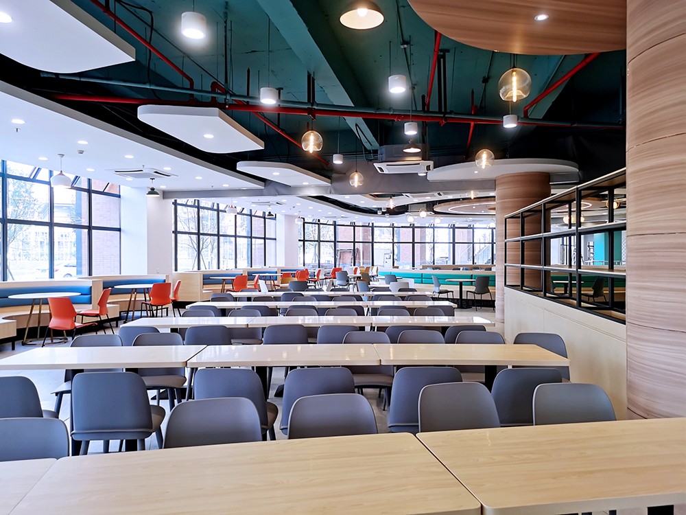 設(shè)計(jì)理念:空間設(shè)計(jì)力在突破傳統(tǒng)食堂形式,表達(dá)校園食堂快樂(lè)食間品牌意識(shí),傳遞快樂(lè)食間價(jià)值觀。為學(xué)生和老師提供有品位的就餐環(huán)境,享受美食之外還具有學(xué)習(xí)、聚會(huì)、獨(dú)處的空間功能。整體空間在以白色為主基調(diào)的設(shè)計(jì)中,將天花裝飾藍(lán)色,柱子選用了一點(diǎn)墨綠色進(jìn)行點(diǎn)綴,以注入環(huán)保、科技、自然等元素,呈現(xiàn)出美感與實(shí)用兼?zhèn)涞膭?chuàng)新設(shè)計(jì)。木質(zhì)桌椅溫潤(rùn)自然,大盆綠植規(guī)律擺放,搭配錯(cuò)落有致,整個(gè)空間自然開(kāi)闊。
