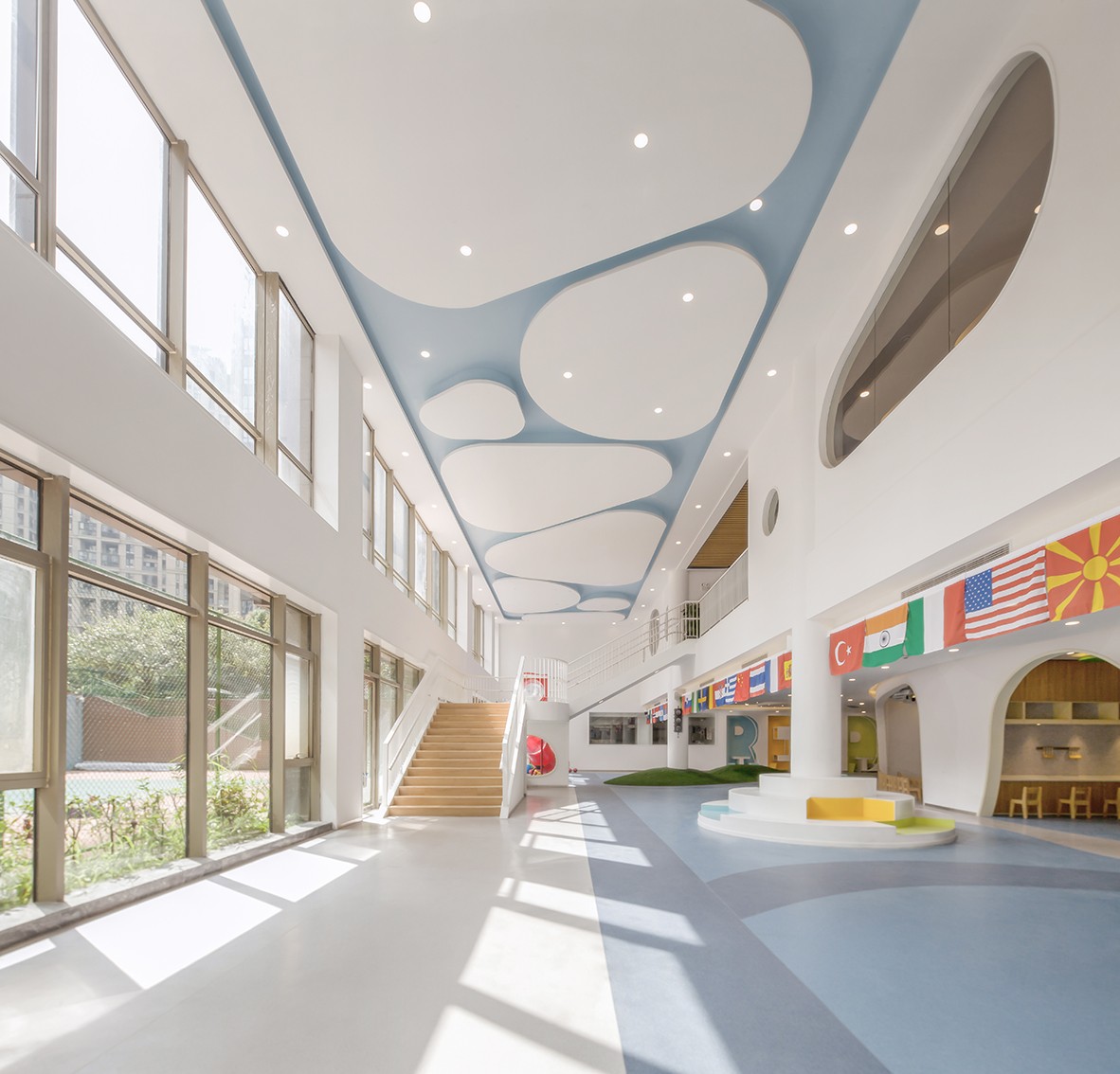 設(shè)計理念:現(xiàn)代簡約風(fēng)格的幼兒園裝修設(shè)計,顯大氣又舒適,更大的空間。在設(shè)計理念、功能布局、室內(nèi)裝飾和家具配置等方面綜合考慮,給予幼兒一個安全、舒適、有益的環(huán)境。